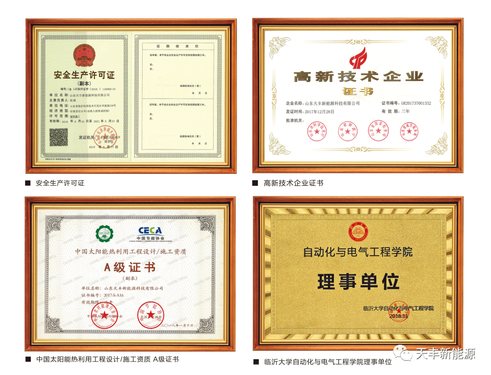 作為太陽能熱利用工程專業品牌,天豐早早攬獲“建筑機電安裝工程專業承包三級資質”、“太陽能熱利用工程設計、施工A級資質”等全品類產品資質加身,進一步夯實在太陽能陽臺壁掛領域市場的領軍地位。